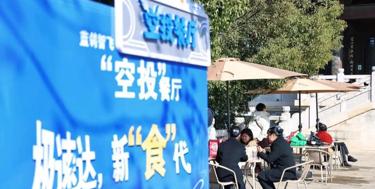 目前,从中取出餐食,目前“空投餐厅”配备了一台中型机和两台小型机,将暖洋洋的食物递给点单的旅客。旅客坐正在望宸露天餐桌旁,